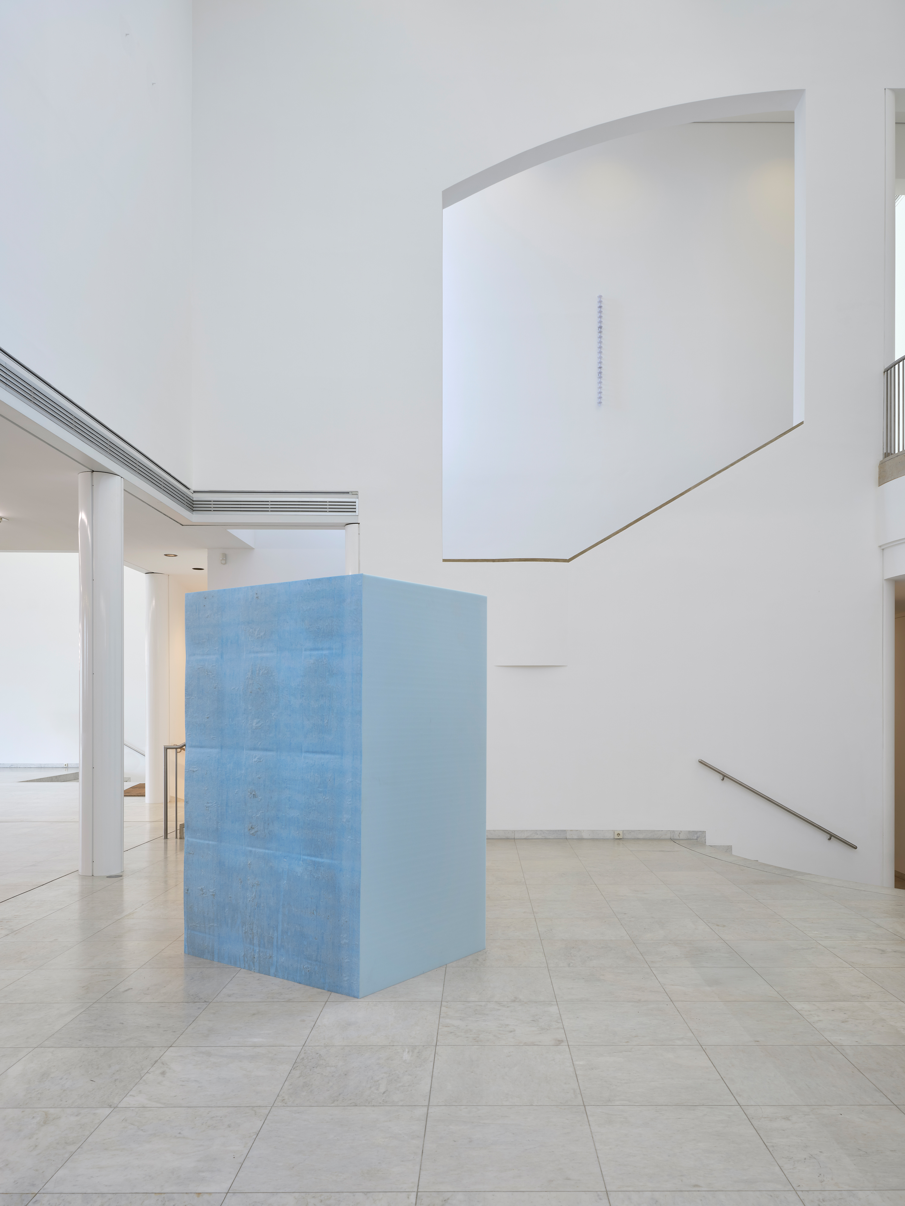 [ID: Eine freistehende quadratische Skulptur aus blauem Polyurethanschaum. Im Hintergrund, hoch an einer Wand über einer Treppe, hängt eine Skulptur aus gestapelten Beatmungsfiltern. Die Filterskulptur wird visuell von einem Gestaltungselement eingerahmt: einem Ausschnitt in der Museumswand. Der Galerieraum hat hohe Decken, gewölbte architektonische Elemente und Treppen, die zu verschiedenen Ebenen führen.]