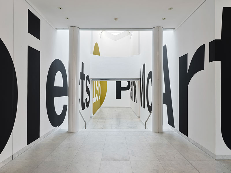 Auch die US-amerikanische Künstlerin Park McArthur, deren Ausstellung Contact M aktuell im Museum Abteiberg (und zeitgleich im mumok Wien) zu sehen ist, nutzt Text in ihrer Auseinandersetzung mit Themen wie Zugang und Wahrnehmung. Wie zahlreiche andere Werke aus der Museumssammlung sind viele von McArthurs Arbeiten speziell für diesen räumlichen Kontext entstanden bzw. nehmen auf die Architektur von Hans Hollein Bezug. Sie befragen u.a., wie wir uns durch Räume bewegen und was unserer Wahrnehmung entgeht. An welchen Orten und in welchen (literarischen) Medien findet Text für gewöhnlich statt? Welche Bildhaftigkeit können Texte lautmalerisch wie auch visuell annehmen und in welchem Verhältnis stehen Raum und Text zueinander?