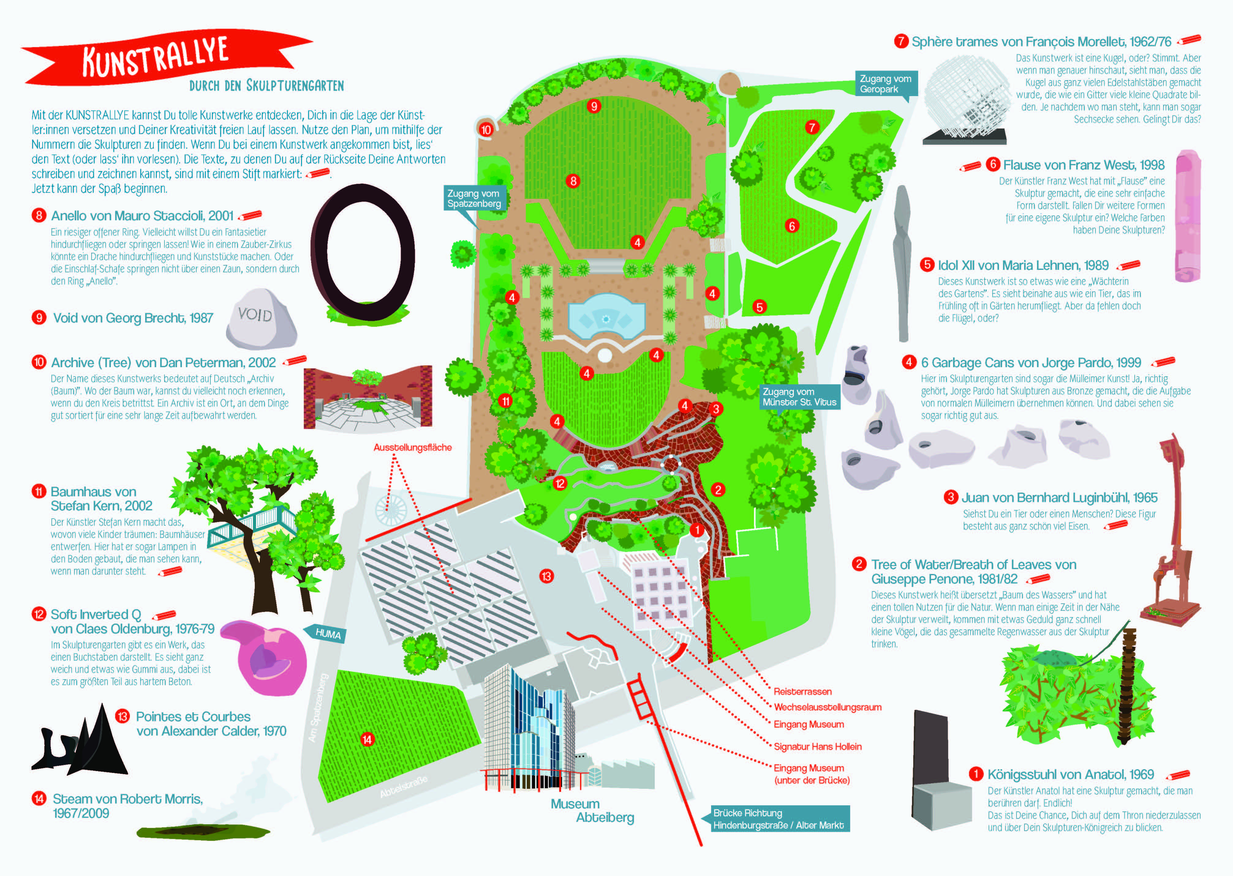 Der Skulpturengarten des Museums ist eine idyllische grüne Oase mitten in der Innenstadt. Grundschüler*innen können die Kunstwerke im Garten spielerisch mithilfe der unterhaltsamen Kunstrallye entdecken. Die Kunstrallye ist kostenfrei. Sie eignet sich für einen Klassenausflug (3 und 4. Klasse) und benötigt keine extra Vermittlung durch das Museum. Die Pläne der Kunstrallye erhalten Sie an der Museumskasse. Bringen Sie einfach für nur Stifte für die Kinder mit. Wir bitten um Anmeldung drei Wochen im Voraus. Der Skulpturengarten ist von Dienstag bis Freitag 11 bis 17 Uhr geöffnet.